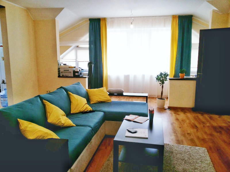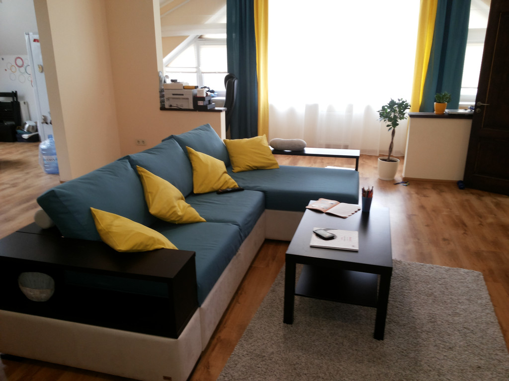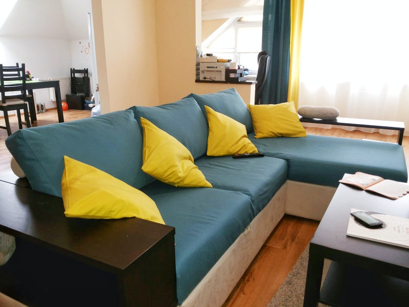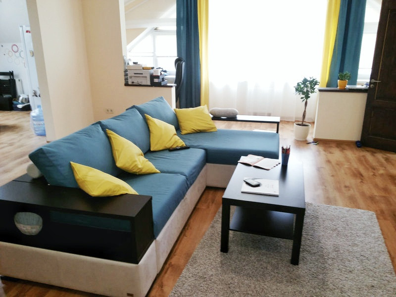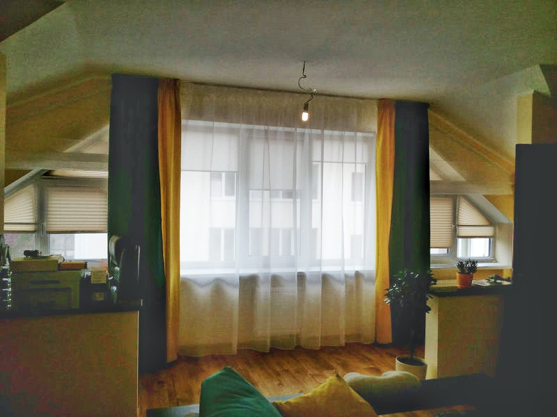 Салон штор LuxDream занимался оформлением однокомнатной квартиры с нестандартной формой окон в Ирпене. Предстояло не только декорировать оконные проемы с помощью тюля и штор, подобрав хорошо сочетаемые друг с другом ткани для штор и обеспечив защиту от солнца, но и полностью завершить текстильное оформление пространства. Мастерами были использованы функциональные шторы–плиссе, а также ролеты, удачно сочетающиеся с ними по цвету и фактуре и позволяющие уменьшить стоимость проводимых работ. Особую сложность представляли боковые части окна угловой формы. Специально для их оформления были пошиты римские шторы из тюлевой ткани, которая незаменима при подобном декорировании. Центральная часть окна была закрыта тюлем классического молочного оттенка и яркими двухцветными шторами, в дополнение к которым были пошиты покрывала и подушки. Смелое сочетание насыщенно синего и ярко желтого цветов значительно «освежило» пространство и придало ему стилистическую завершенность.